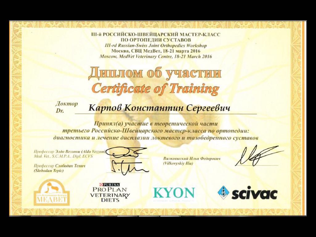 2016 год – прошёл мастер-класс «Болезни и лечения локтевых и тазобедренных суставов», лекторы Слобода Тепич и Элдо Веззони.