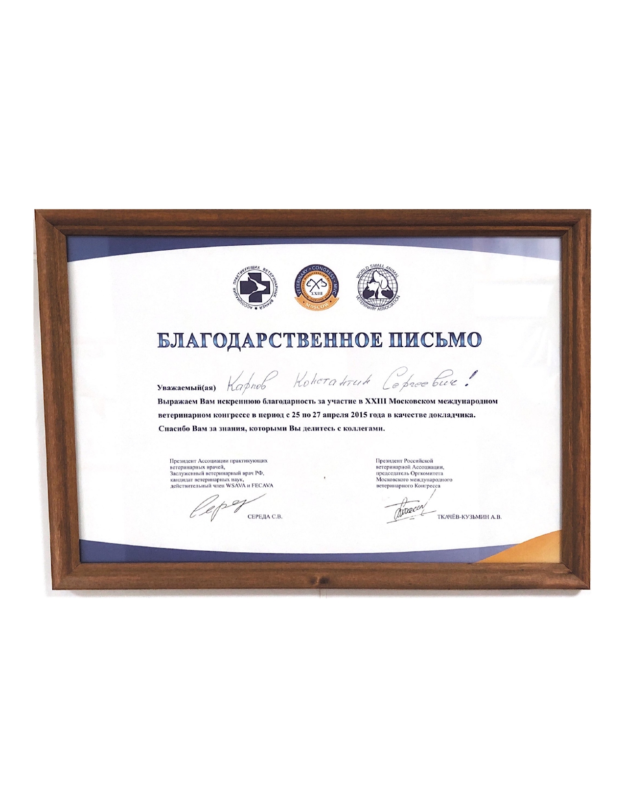 2015 год – участник в качестве докладчика в Московской ветеринарной конференции.