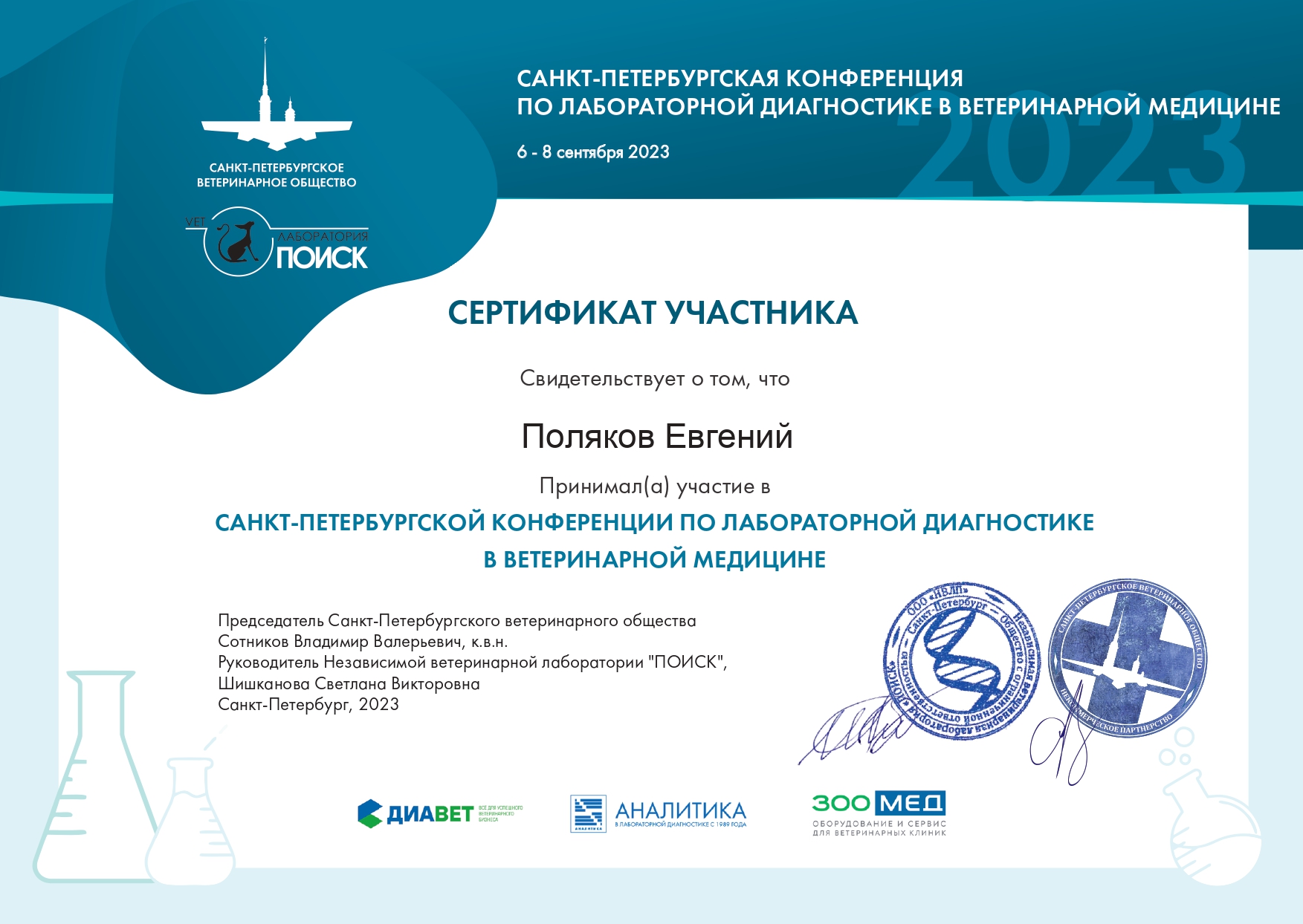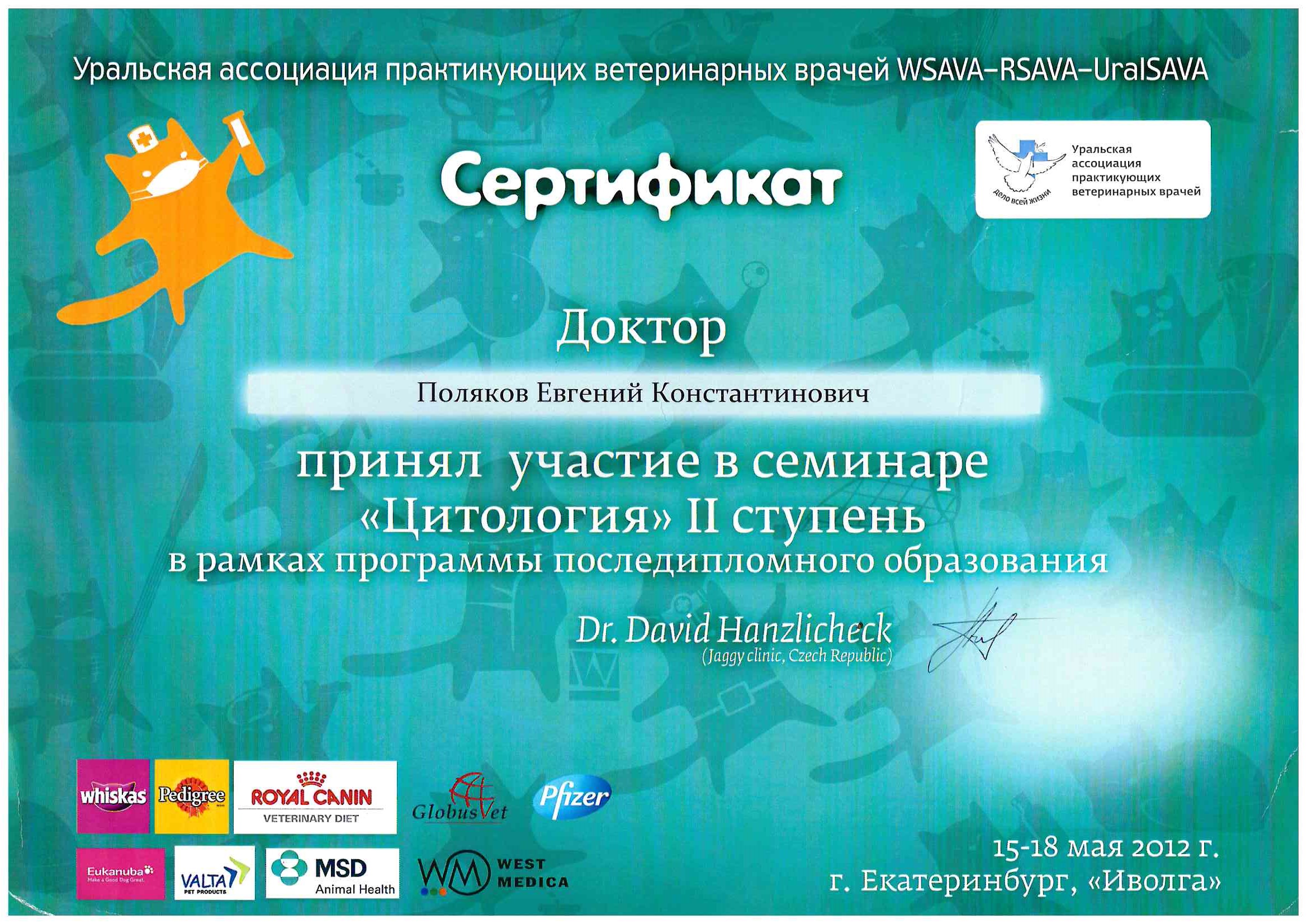 2012 год – постдипломное повышение квалификации в области онкоцитологии – WSAVA-RSAVA-UralSAVA, цитология.