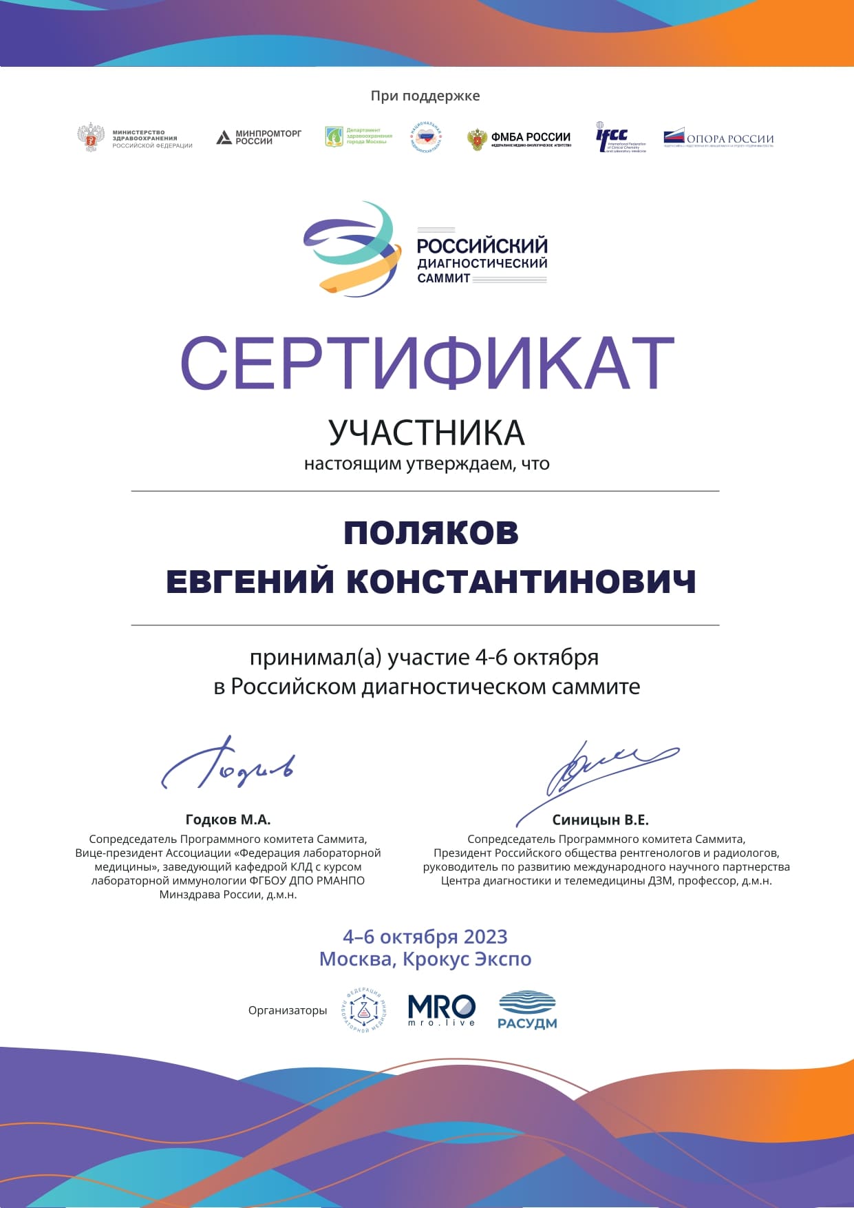 2020 год – окончил курс профессиональной переподготовки по образовательной программе дополнительного профессионального образования «Патологическая анатомия животных» с присвоением квалификации: ветеринарный врач-патологоанатом с правом ведения профессиональной деятельности в области патанатомии, гистологии и цитологии.