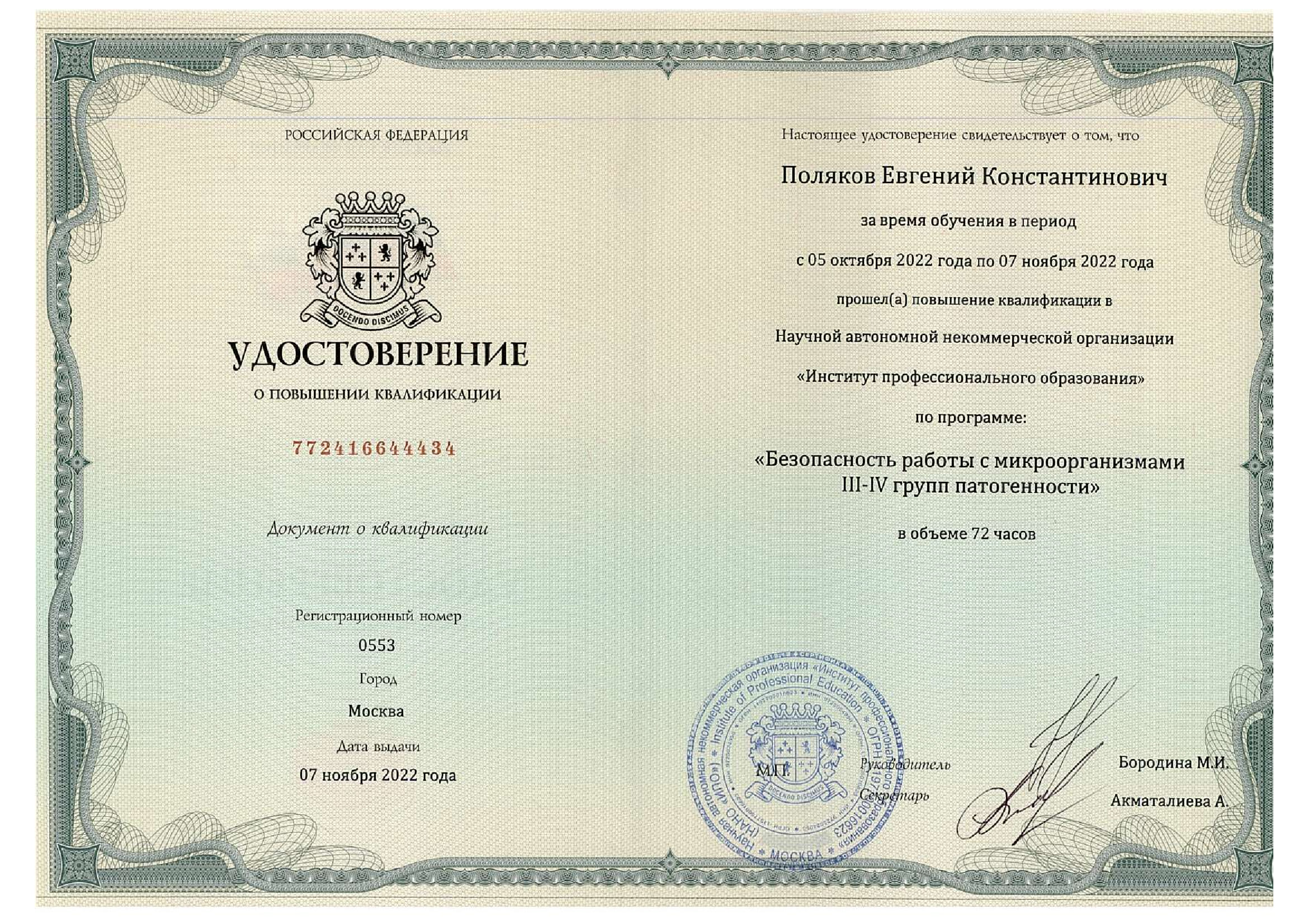 2022 год – повышение квалификации «Безопасность работы с микроорганизмами III-IV групп патогенности» НАНО «Институт Профессионального Образования».