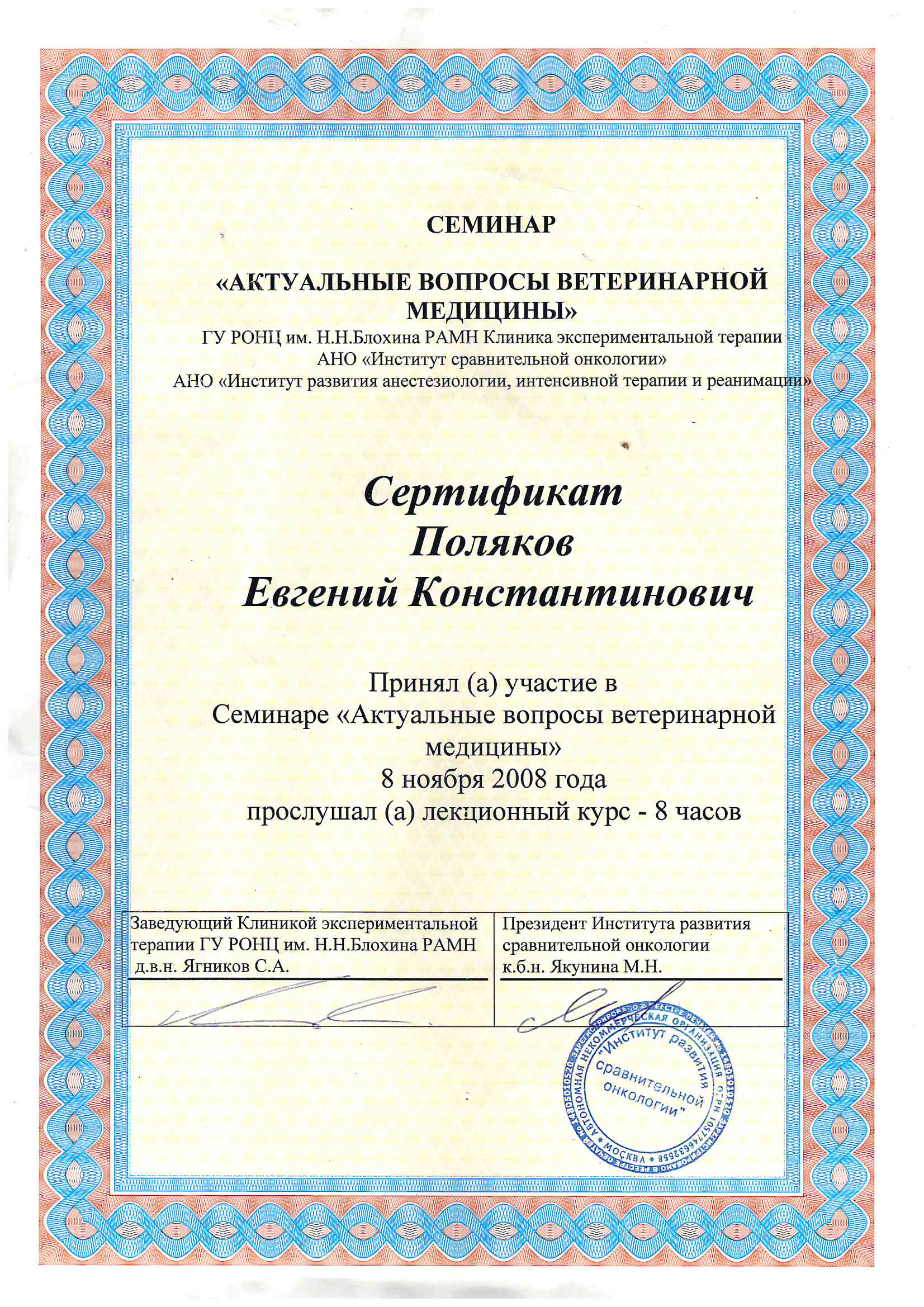 2016 год – сертификат специалиста в сфере обращения лекарственных средств для ветеринарного применения ВГНКИ, фармакология.