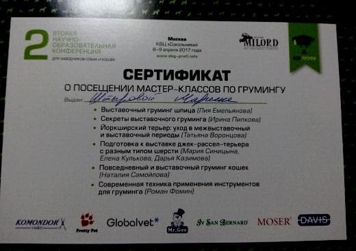 В 2015 году закончила обучение в школе груминга ГРУМ-ПРОФИ.