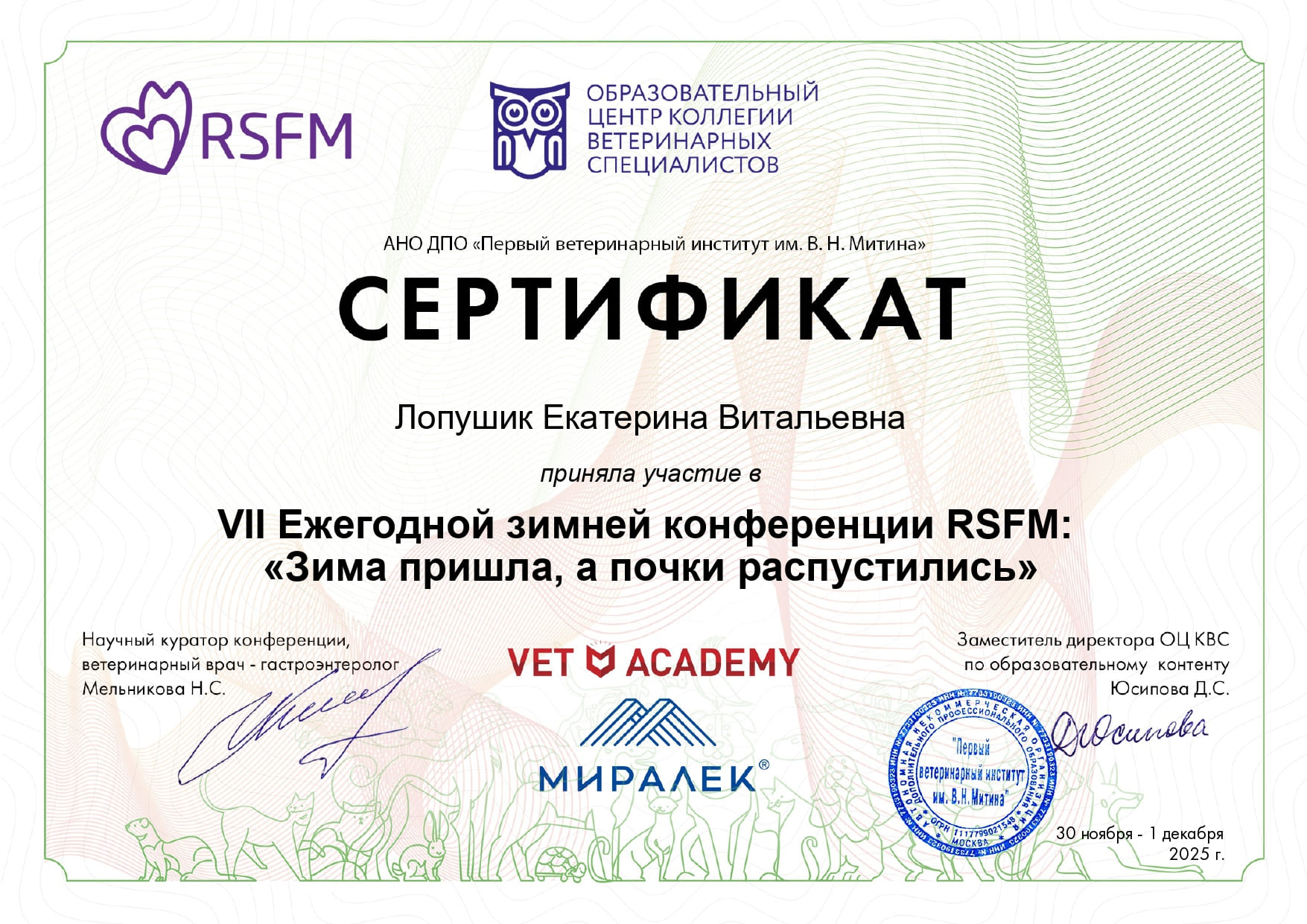- Участие в VII ежегодной зимней конференции RSFM: «Зима пришла, а почки распустились» в АНО ДПО «Первый ветеринарный институт им. В. И. Митина».
